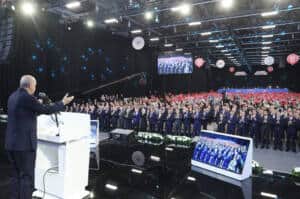 6 Şubat 2023’te yaşanan depremlerin ardından Türkiye’nin etkilenen illerinde hızlı bir şekilde yeniden imar ve ihya çalışmalarının başladığını hatırlatan Erdoğan, kısa sürede 455 binden fazla konut ve iş yerinin hak sahiplerine teslim edildiğini açıkladı. Depremden etkilenen şehirlerde üretim, ticaret, eğitim ve sosyal hayatın eski canlılığına kavuştuğunu söyledi.
