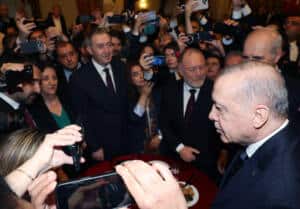 Cumhurbaşkanı Erdoğan, tören alanı yanında yer alan Mermerli Salon’da Cumhurbaşkanı Yardımcısı Cevdet Yılmaz, kabine üyeleri ve bazı davetlilerle sohbet etti. Ardından TBMM Başkanı Kurtulmuş ile birlikte tören salonuna geçen Erdoğan, burada basın mensuplarının sorularını yanıtladı.