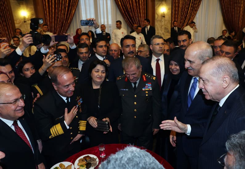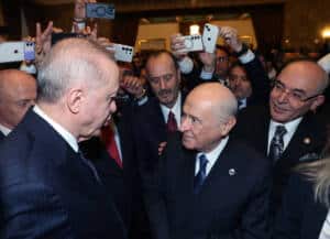Resepsiyon sırasında MHP Genel Başkanı Devlet Bahçeli ile kısa bir sohbet gerçekleştiren Erdoğan, DEM Parti Eş Genel Başkanı Tuncer Bakırhan, TBMM Başkanvekili Pervin Buldan ve diğer DEM Partililerle de bir araya geldi. Ayrıca Fenerbahçe Kulübü Başkanı Sadettin Saran ve diğer davetlilerle selamlaştı.